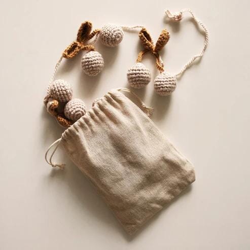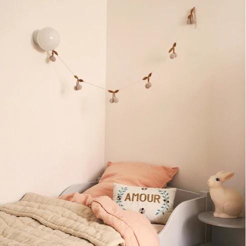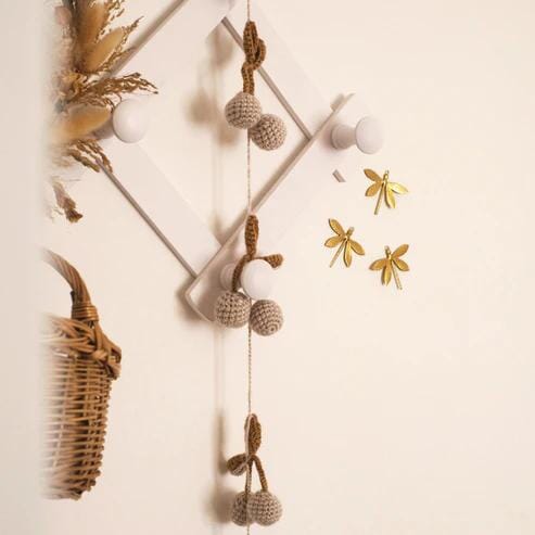 Slinger met gebreide kersen van Gentil Coquelicot. Deze gehaakte slinger geeft de kinderkamer een bohemien en natuurlijke uitstraling. De kersen zijn met de hand gebreid in beige tinten. De slinger wordt geleverd in een mooi herbruikbaar katoenen zakje. Hang hem aan een muur naast het bed, boven het hoofdeinde, tussen een hemelbed en een muur, waar je maar wil!