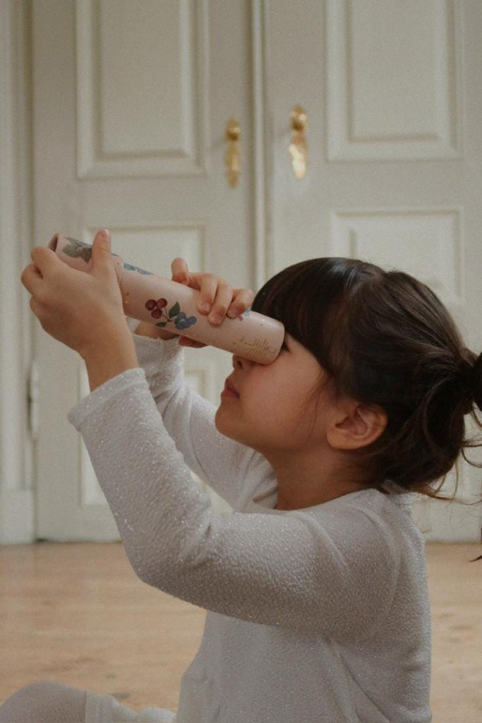 Caleidoscoop in de print Cremona van Konges Sløjd. Kijk naar binnen en ervaar de patronen en kleuren die ontstaan door de reflecties van de spiegels en de gekleurde parels binnenin.