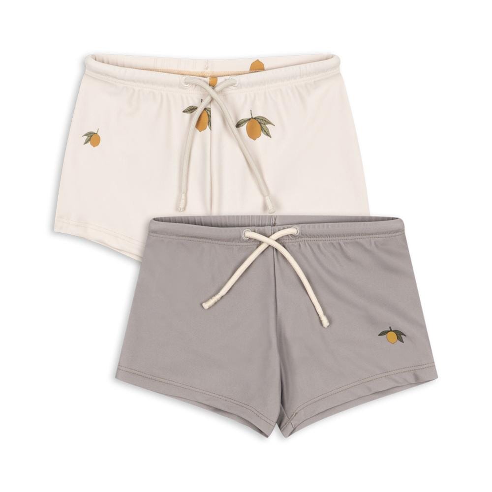 Set of two Aster swim shorts in the Mon grand citron print and Laurel oak colour from Konges Sløjd. These quick-drying swim shorts have a comfortable and snug fit.