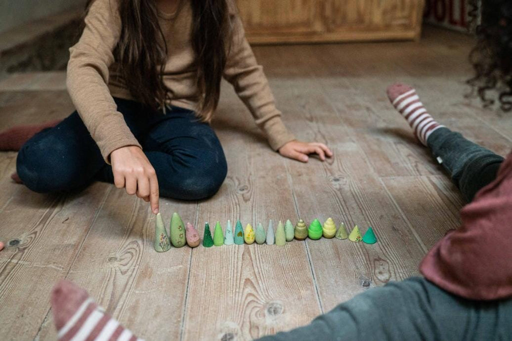 Forest Tree wooden trees by Grapat. A forest in your hands – this set of hand-painted wooden trees is designed for open-ended play, with soft shapes and earthy tones that invite little ones to build, organize, and explore freely. Whether they’re creating a setting for little animal friends, building a forest path, or simply exploring and sorting, these trees bring nature into the playroom and encourage quiet moments of curiosity, concentration, and connection.