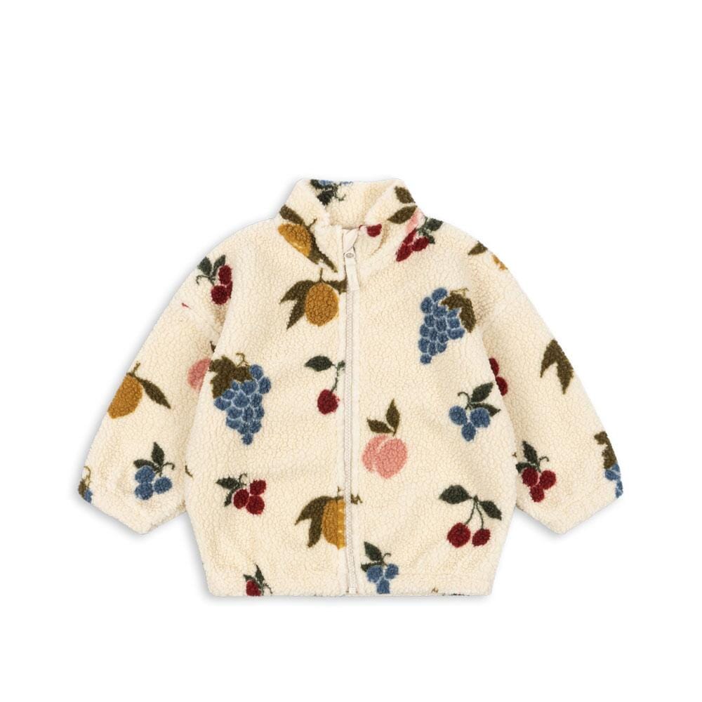 Warme teddyjas met fruitprint van Konges Slojd. Deze jas heeft een zachte binnenkant van fleece, een hoge kraag en elastische manchetten.
