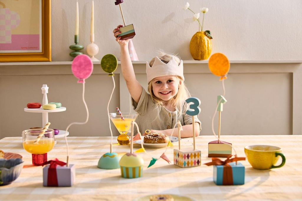 Houten verjaardagsdecoratieset van Kid's Concept. Deze tafeldecoratieset bestaat uit vijf stukken in de vorm van cadeaudozen, taartjes en een cupcake. Op elk stuk staat een cijfer om de leeftijd van de jarige aan te geven. De set wordt geleverd met houten cijfers van 0 tot 9 en een extra cijfer 1, waardoor hij voor vele verjaardagen kan worden hergebruikt.
