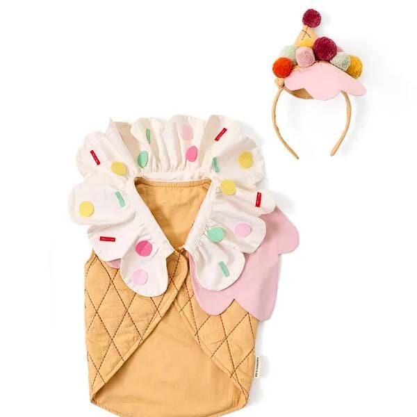 This costume set turns everyday play into something really fun. The cardigan is shaped like an ice cream cone, is lightly padded and has a checked pattern that mimics the texture of waffle batter. Around the neck is a soft, supple collar that looks a bit like melting scoops of ice cream – but without the sticky bits.
