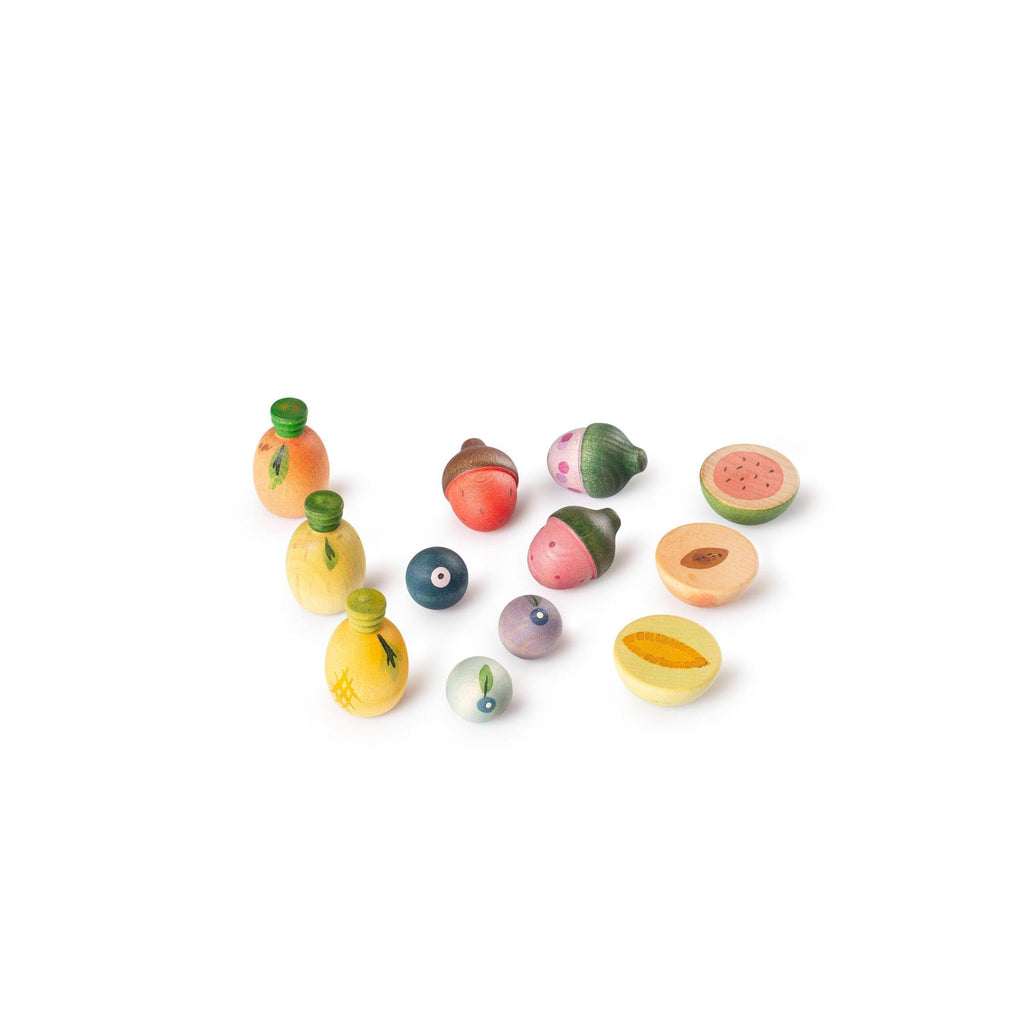Holzfrüchte von Grapat. Haben Sie schon einmal die Farben eines Regenbogens geschmeckt? Diese handbemalten Holzfrüchte laden Kinder ein, eine farbenfrohe Welt voller klarer Formen und leuchtender Farben zu entdecken. Von saftigen Beeren bis hin zu Zitrusfrüchten regt jedes Stück zum Pflücken, Teilen und Kombinieren an und fördert so symbolisches und freies Spiel.