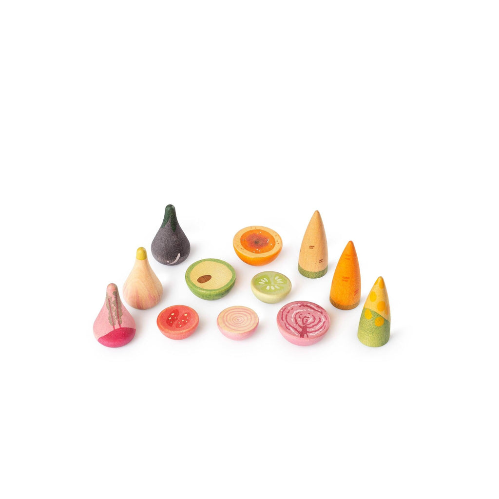 Holzgemüse von Grapat. Zeit, Spaß mit der Ernte zu haben – was wirst du zubereiten? Dieses handbemalte Holzgemüse bringt die frische Ernte aus dem Garten direkt in die Spielzeit. Knackige Karotten, saftige Tomaten und Blattgemüse laden Kinder ein, zu schneiden, zu sortieren und alle möglichen Mahlzeiten zu kombinieren, was das symbolische Spiel fördert. Ob es ein geschäftiger Markttag oder ein Familienessen ist, dieses Gemüse verleiht jedem Spielerlebnis eine farbenfrohe und schmackhafte Note.