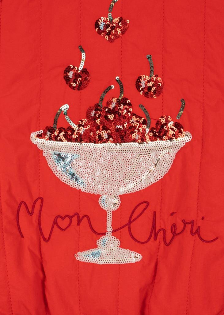 Bomberjas met sequin appliqué van Konges Sløjd. De Juno thermojack is een echte favoriet, met polyester vulling voor effectieve isolatie en een ademende, fluorvrije impregnering die het jack zowel winddicht als waterafstotend maakt.