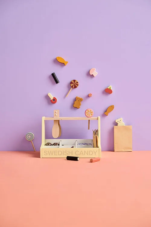 Swedish Candy Play Shop van Kid's Concept. Deze snoepwinkel is nu geopend voor alle kinderen met een zoetekauw. De snoepwinkel staat vol met heerlijke lekkernijen zoals gummibeertjes, colaflesjes, punchpralines en lolly's – allemaal gemaakt van hout! Vergeet ook niet de geliefde ‘saltlakrits’ (zoute dropstokjes), die perfect combineren met de frambozenstokjes voor een supercombinatie.